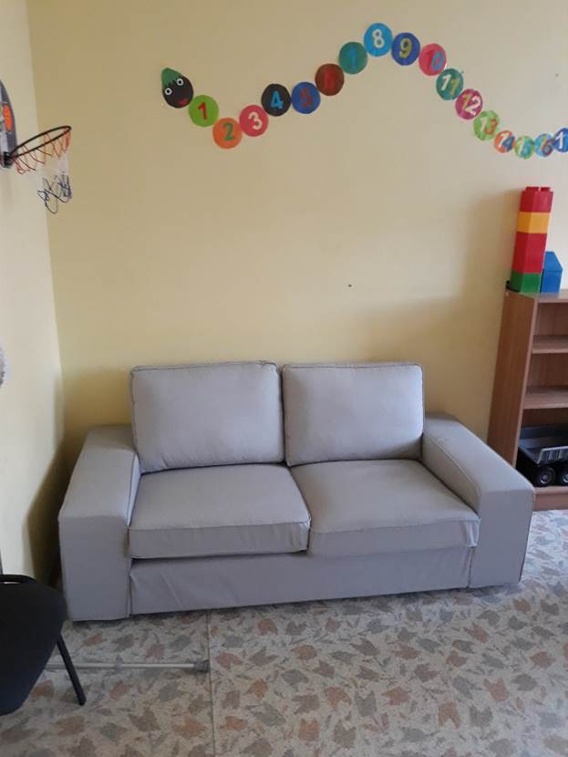 Privātpersonas ziedojums klientu vajadzībām – dīvāns mājīgākas vides radīšanai.