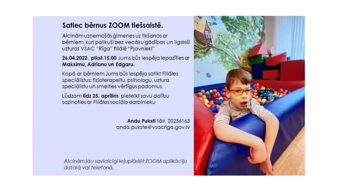 2022.gada 29.martā plkst. 15.00 aicinām uzņemošās ģimenes ZOOM tiešsaistē tikties ar bērniem, kuri ilgstoši uzturas VSAC “Rīga” filiālē “Pļavnieki” un ir palikuši bez vecāku gādības. Uzņemošās…